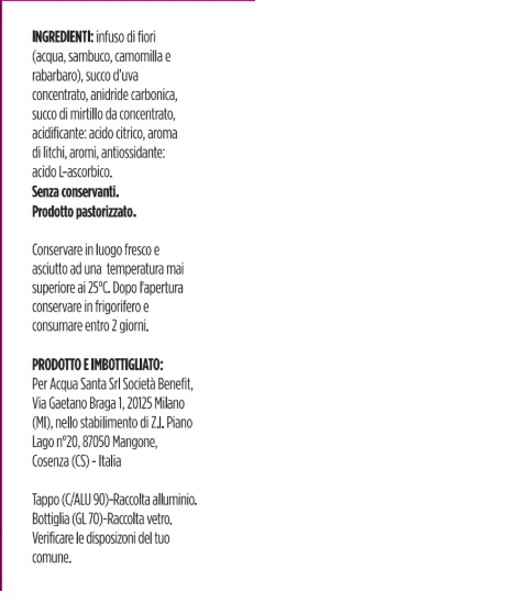 Infuso di fiori (acqua, sambuco, camomilla e rabarbaro), succo d’uva concentrato, anidride carbonica, succo di mirtillo da concentrato, acidificante: acido citrico, aroma di litchi, aromi, antiossidante, acido L- ascorbico.