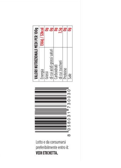 Energia 136 kj/32 kcal, Grassi 0,0 g di cui acidi grassi saturi 0,0 g, Carboidrati 8 g di cui zuccheri 7,5 g, Fibre 0,0 g, Proteine 0,0 g, Sale 0,0 g.